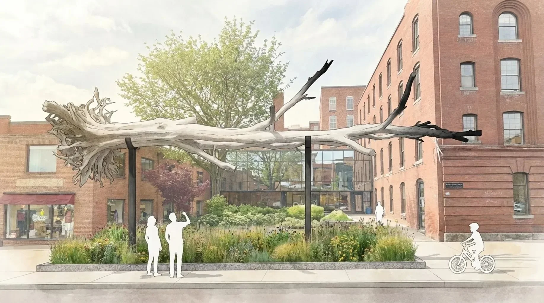 Lakebone is a large, whitened, horizontal tree suspended by steel posts over a pollinator meadow. Located on the sidewalk of downtown Burlington, Vermont, the local materials invite the city residents and visitors to experience a new relationship to the trees and fields of Vermont.