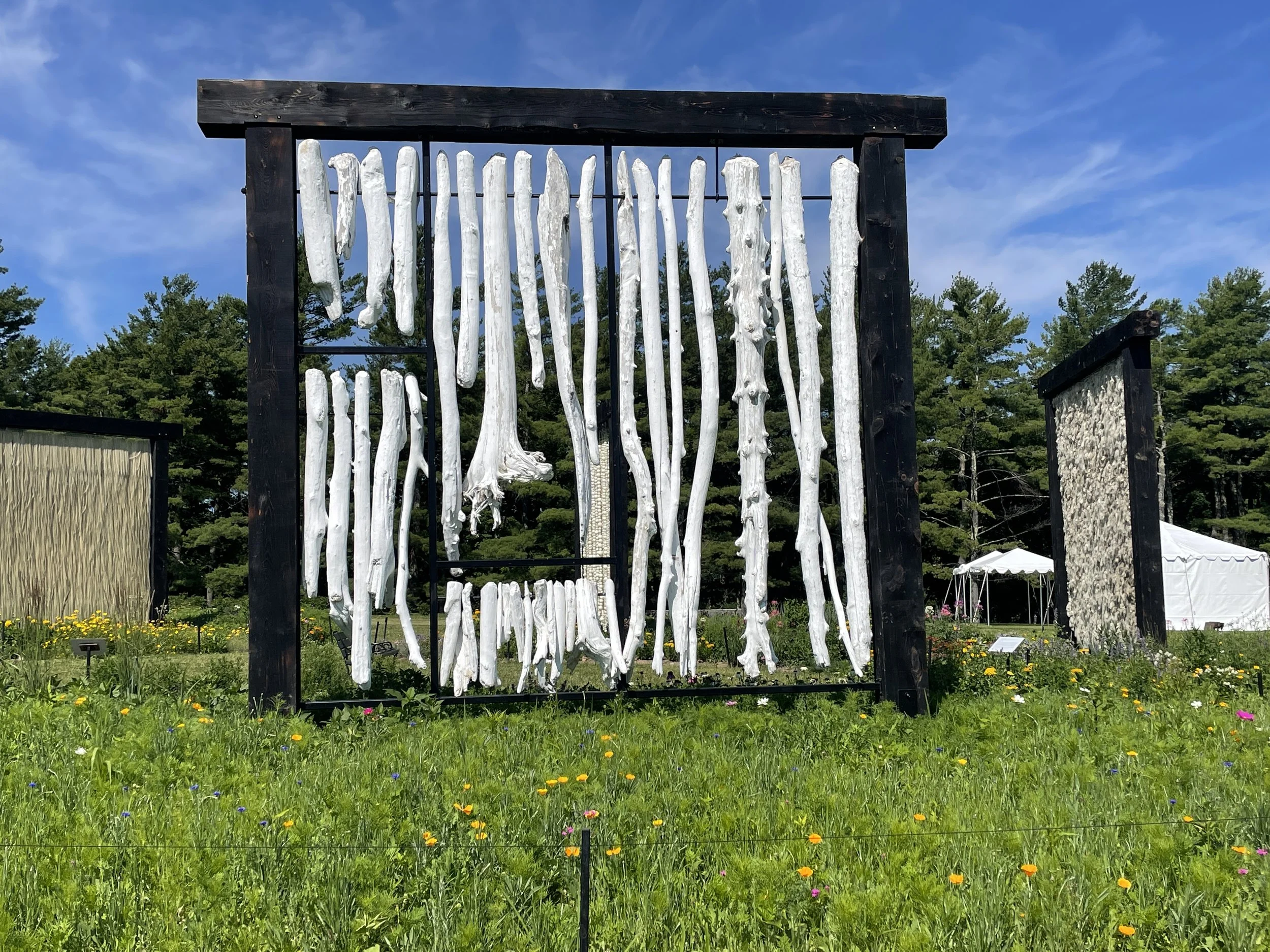 The driftwood Winship Milliken gathered for Lake Bones was harvested along the shorelines of Lake Champlain and its tributary streams and rivers. After water, wind, and sun first shape and smooth the wood into abstracted forms, Winship Milliken returns the timber to the land and to its original, upright orientation. The artist honors this transformative process and the wood’s new identity by applying a white limestone wash. Coated in this material commonly found in Shelburne, the irregularly shaped driftwood is unified through its new sheen and shared metamorphic journey.