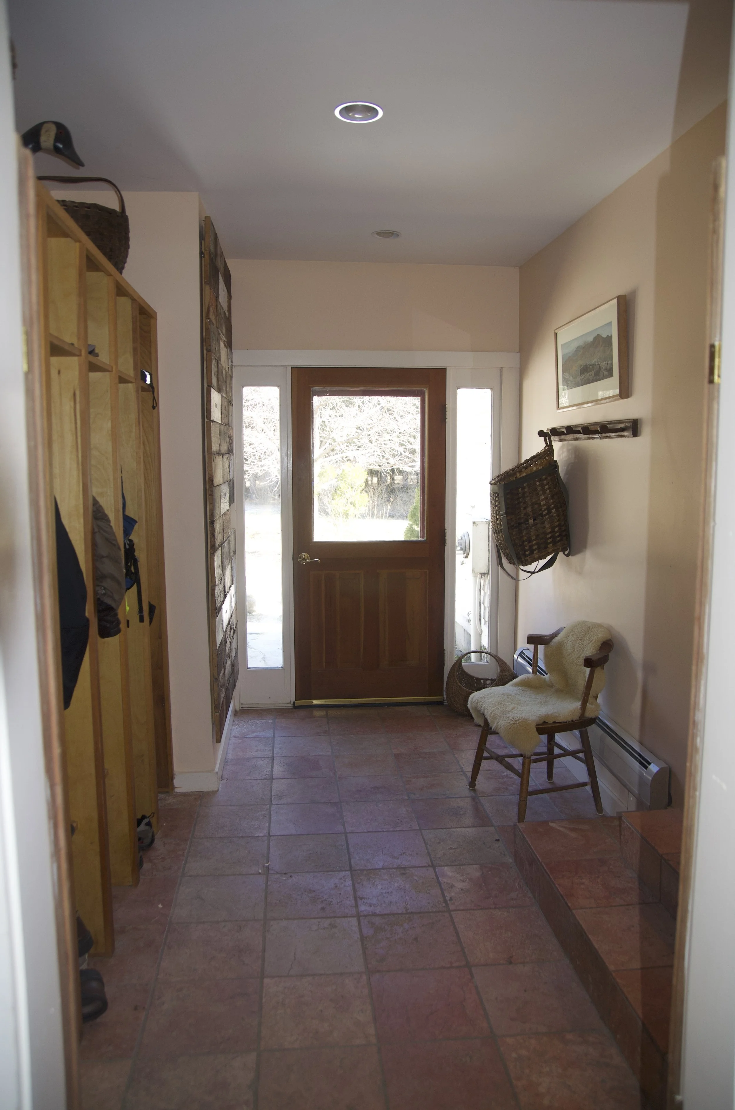 Working on design and material choices with design build firm New Frameworks out of Burlington, Vermont, we changed an energy inefficient and outdated ranch into an artistic expression of sustainability, material choices and net-zero living. Using local materials such as cedar and cherry wood with limestone from down the road, barn beams from a neighboring farm, and charred timber, the home now has an elegant textural feel to it. The layout was opened up and a private nook with a day bed provides a quiet place to read on a snowy afternoon.